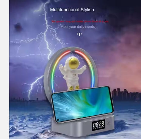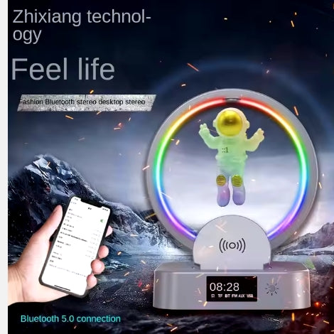 Este Reloj Despertador con Cargador Inalámbrico combina funcionalidad con diseño moderno y cuenta con una lámpara de levitación magnética, cargador inalámbrico, soporte para teléfono, altavoz Bluetooth y despertador.